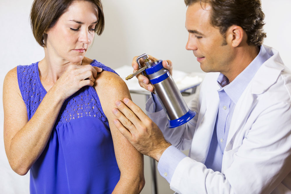 Your skin cancer doctor will usually spray (or less commonly apply by using a swab) the cold liquid onto the sunspot or skin cancer for a few seconds or longer depending on the type and size of the lesion.